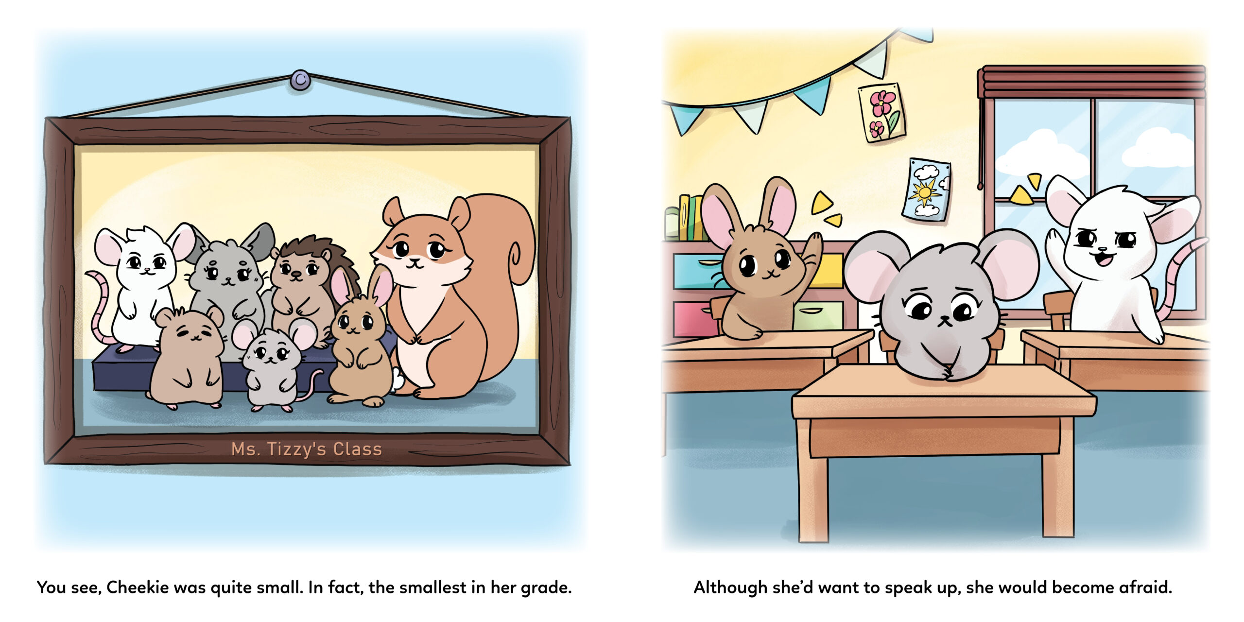 Cheekie Squeaks is the story of a little mouse who is too afraid to use her squeak. In a world full of loud voices, she begins to believe hers doesn’t matter.